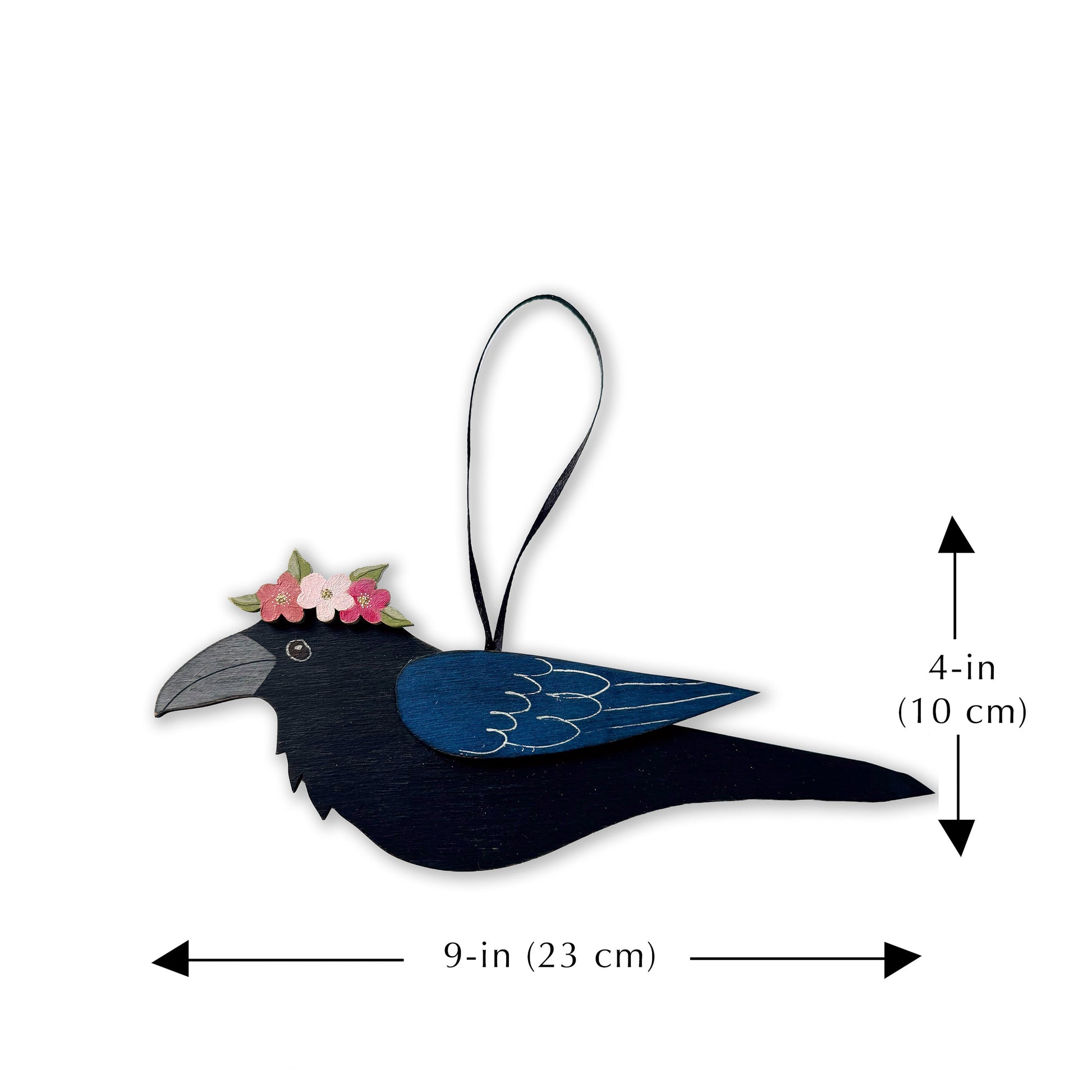 RAVEN WITH BLUE FLORAL CROWN — Hand-Painted Wooden Raven Hanging